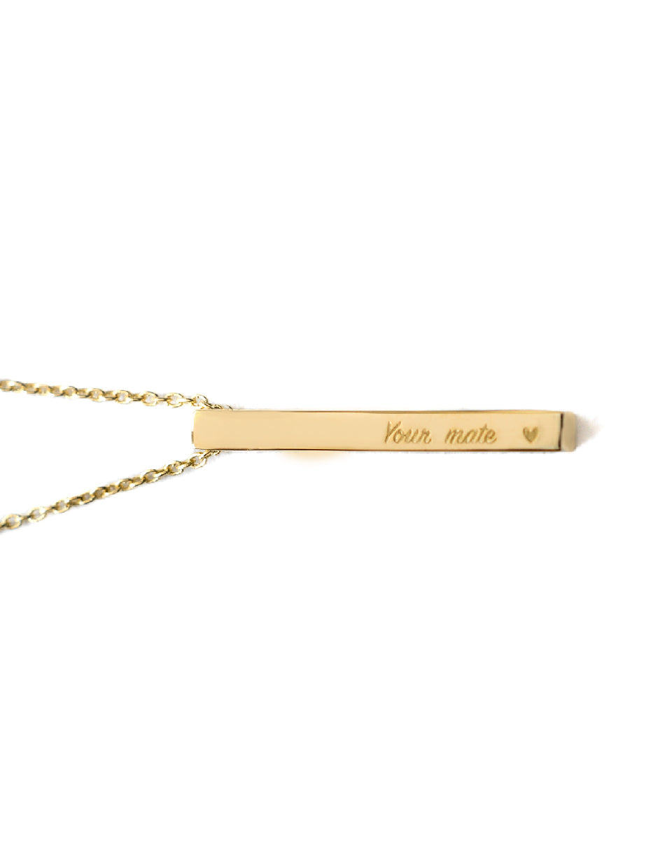 Diseño moderno y minimalista del collar con un dije de barra sólida que ofrece cuatro caras lisas, cada una lista para ser grabada con los nombres de tus hijos, una fecha especial, o una frase significativa.