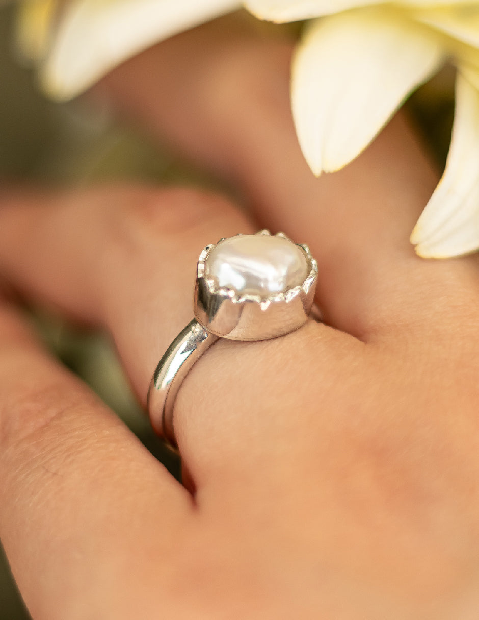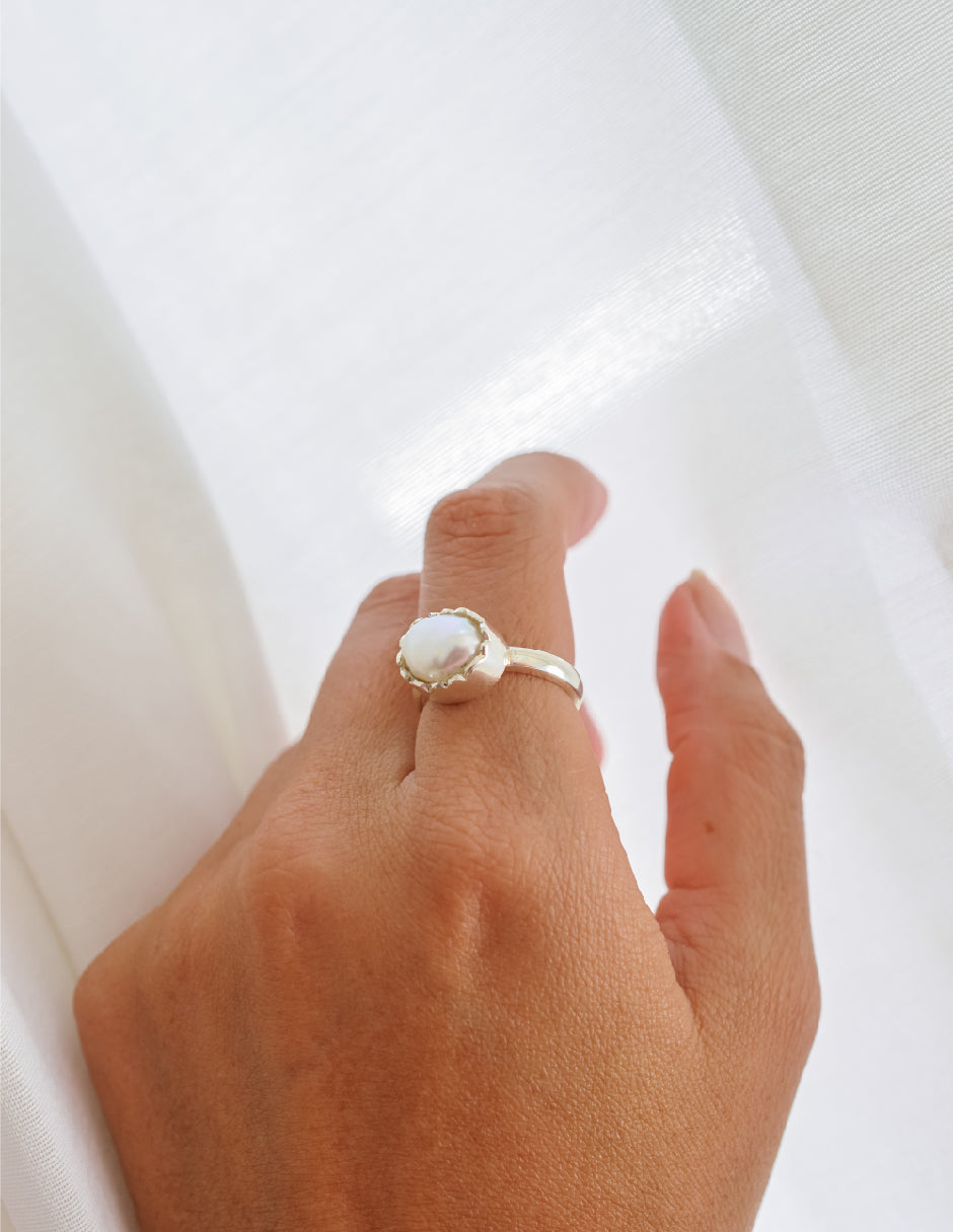 Anillo de perla cultivada con Plata .925. Este accesorio combina la pureza de la perla con la elegancia duradera de la plata, creando una joya que te conecta con la esencia del mar.
