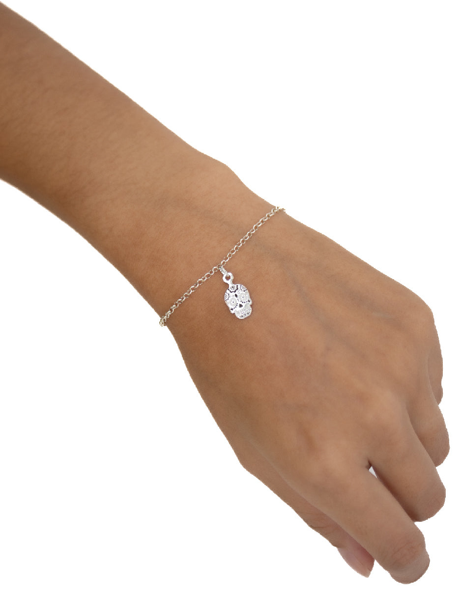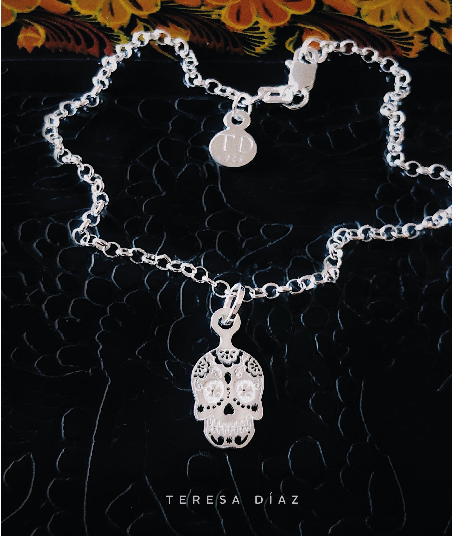 Pulsera en Plata .925 con un dije en forma de calavera, esta pieza es parte de nuestra colección "Hecho en México". Está inspirada en las calaveras que usamos en nuestras ofrendas en Día de Muertos. Es una pieza diseñada para honrar nuestra cultura y tradiciones.