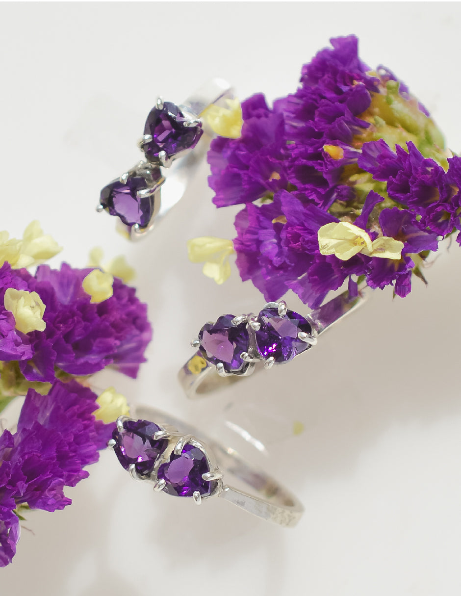 Anillo de Plata .925 con dos Amatistas en forma de corazón son un tributo al amor y la belleza, destacando la elegancia atemporal. En el centro, dos corazones de amatista resplandece con su tono púrpura profundo y apasionado, capturando la esencia misma del sentimiento humano más sublime.
