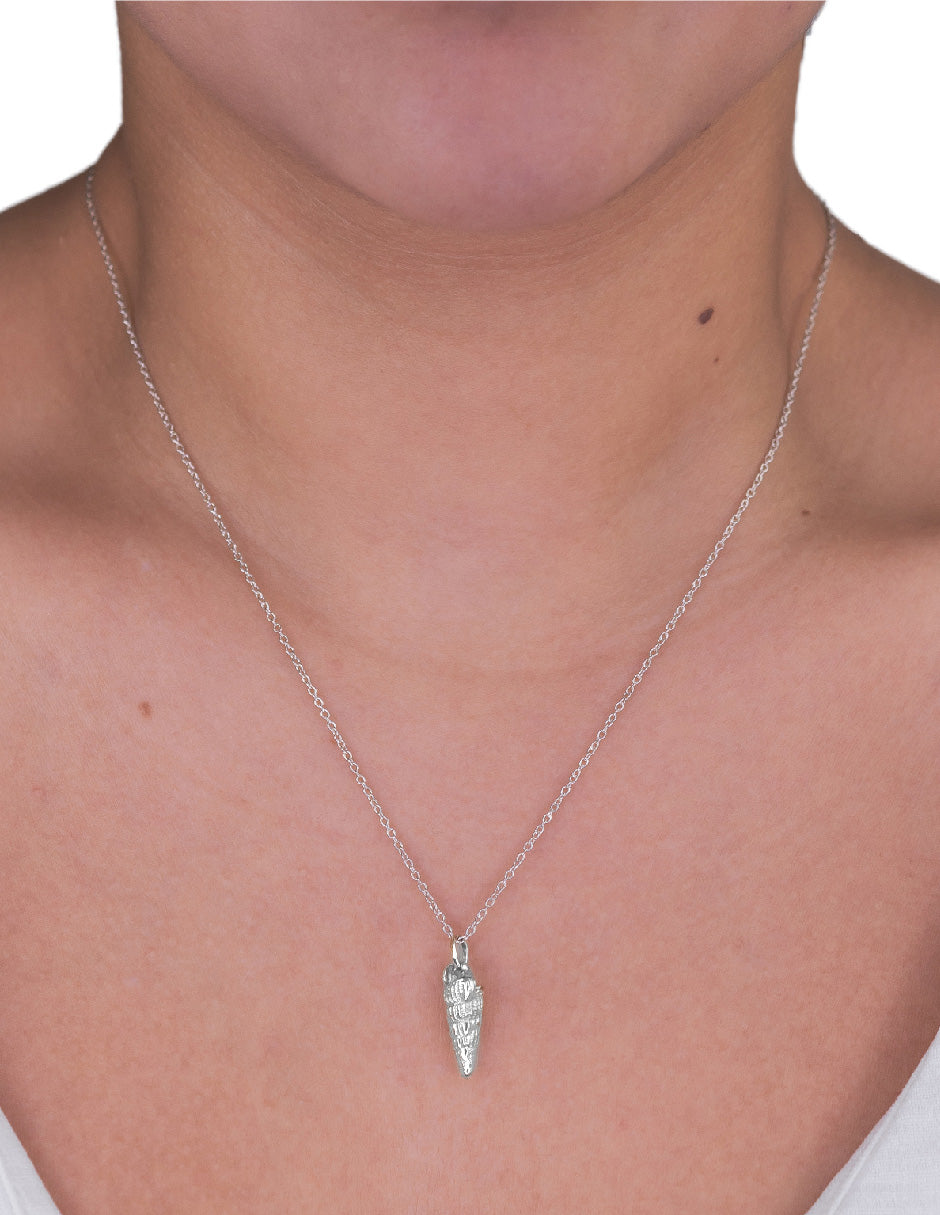 Collar de Plata .925 de caracol, es parte de nuestra colección "Trídas del Mar". Su diseño fue sacado de un caracol recolectado de las playas de Tulum , México. La forma en que el caracol se mueve con calma y paciencia a lo largo de su camino puede ser un recordatorio de la importancia de la paciencia y la serenidad en tu propia vida espiritual. Llevar un caracol de mar en tu collar podría ayudarte a cultivar estas cualidades.